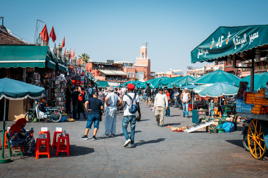 Jemaa el-Fnaa is the main square in Marrakesh’s Medina. No matter what time of day or night you come here, there’s street theater non-stop. From street food stalls to street performers and musicians, the square has always a show going on – especially at night!